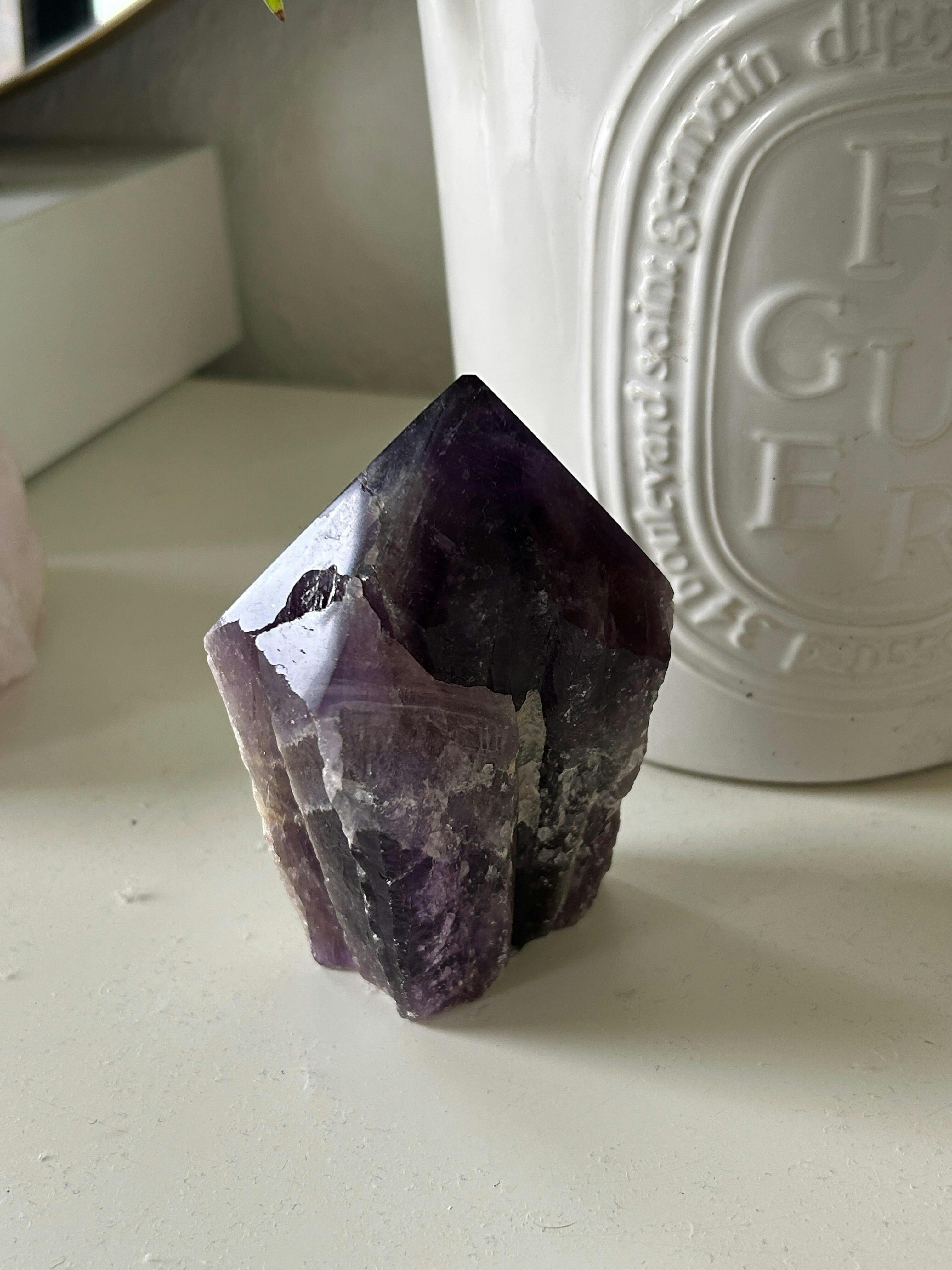 Amethyst, with its deep violet glow, is a stone of clarity and peace, offering a gentle yet powerful energy that stills the mind and soothes the spirit. This beautifully polished point helps to dissolve mental fog, release stress, and create space for calm reflection, allowing your thoughts to settle and your inner voice to be heard. Its connection to the crown chakra opens the way for higher understanding, guiding you towards balanced decisions and a deeper sense of harmony. In meditation, it encourages a serene state where insight can naturally arise, restoring equilibrium to both mind and emotions. Whether placed in your sacred space, carried close, or used as a focus during mindful practices, this crystal serves as a tranquil companion, reminding you that true peace begins within.