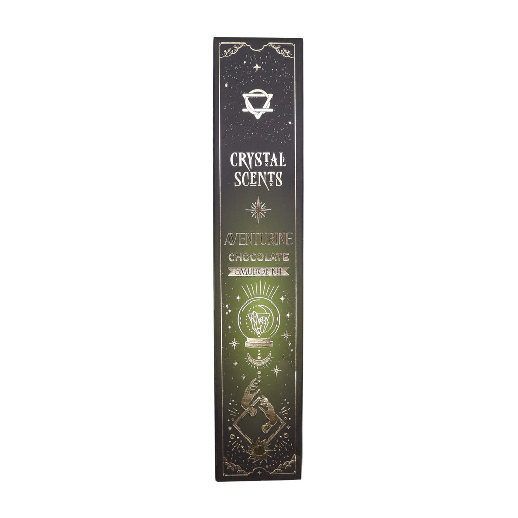 Each pack contains 10 handcrafted chocolate-scented smudge sticks and matching Aventurine crystal.