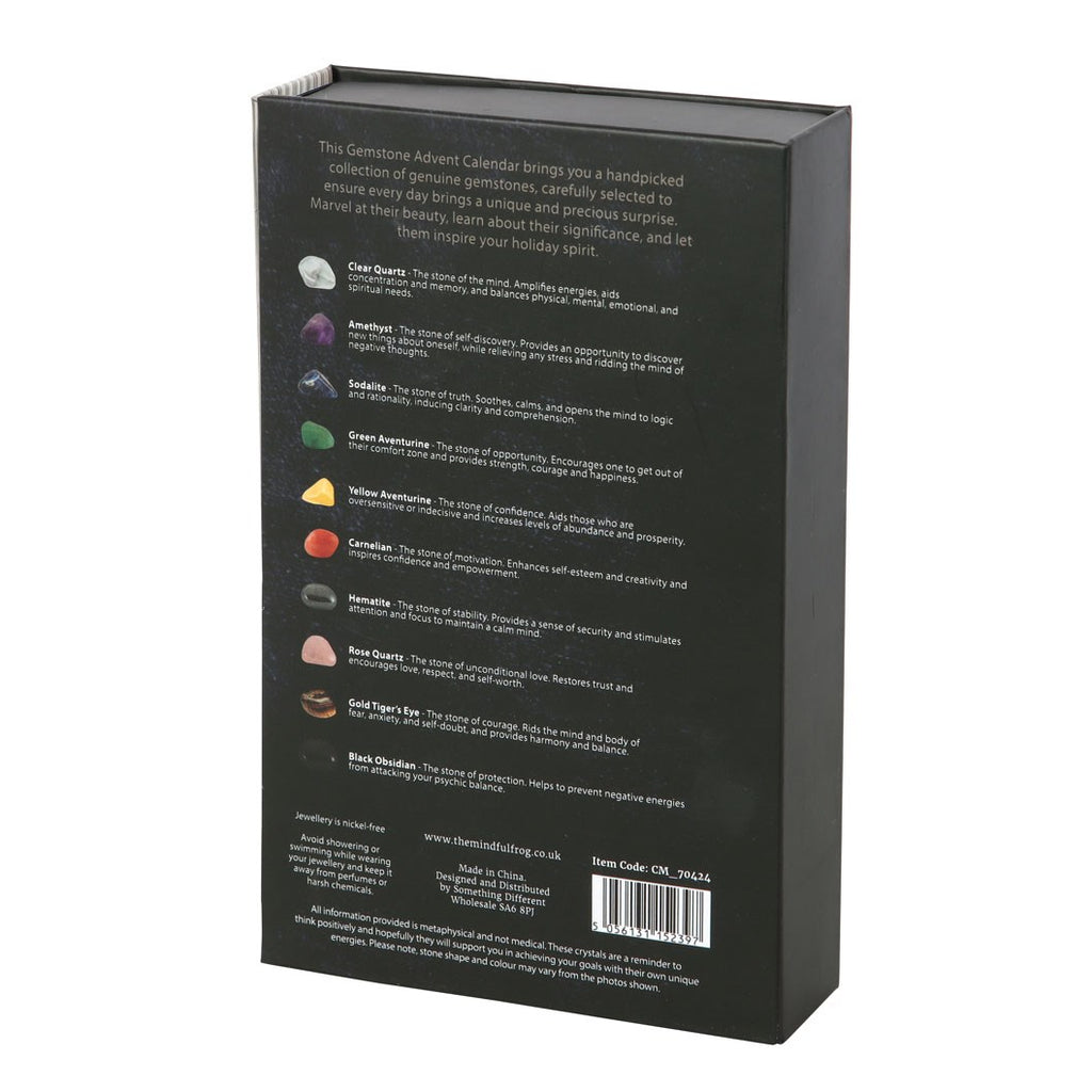 Celebrate the countdown to Christmas with the crystal necklace advent calendar. This beautiful advent calendar includes an interchangeable necklace with 10 different gemstones and a handy storage bag. Each day reveals a new gemstone to add to your collection. The gemstones featured in this advent calendar are clear quartz, amethyst, sodalite, green aventurine, yellow aventurine, carnelian, hematite, rose quartz, gold tiger's eye and black obsidian.Size, shape and colour of stones may vary, making each crystal unique